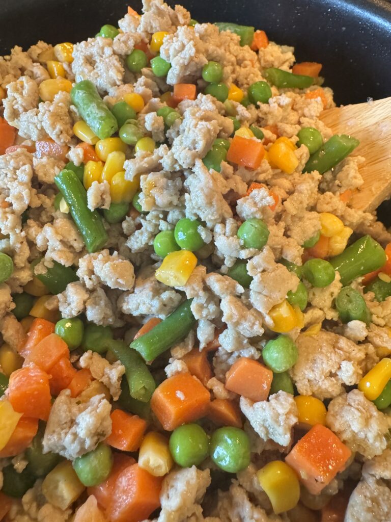 Add the frozen veggies directly to the pan. Season lightly again and mix everything together. Cover and let simmer for about 10–15 minutes, until the vegetables are tender and everything is well combined.