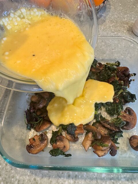 3. Prepare the eggs and assemble the frittata – In a separate bowl, whisk together the eggs and cottage cheese until smooth. Add salt and freshly cracked black pepper, then give it a quick extra whisk to make sure everything is well combined. Spray your baking dish with cooking spray to prevent sticking. Spread the sautéed veggies in an even layer in the dish, then pour the egg mixture into the middle of the veggies. This helps keep the veggies in place so each bite has a balanced amount of eggs and vegetables, and pouring in the center creates a nice even layer of eggs throughout the frittata.