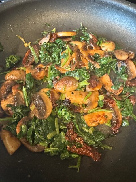 - Sauté the veggies – Melt butter in a skillet and add the mushrooms. Cook on medium-low heat at first so they cook through and release their liquid, then increase to medium and cook until they develop a beautiful golden-brown sear. Stir in the sun-dried tomatoes with a bit of their oil, then add the spinach. Cook until everything is well combined (if using fresh spinach, it will release a bit more liquid).